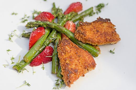 Zum Anrichten nehmen Sie die Spargel- und Erbeerstücke aus der Salatsauce, lassen sie gut abtropfen und legen sie auf den Teller. Die Brathähnchen nehmen Sie aus der Pfanne legen sie kurz auf ein Küchenkrepp zum entfetten. Dann zum Spargel und den Erdbeeren auf den Teller. Ein paar Tropfen Zitronensaft auf das Fleisch kann nicht schaden. Darüber streuen Sie noch etwas Kresse. Gibt eine interessante Schärfe und sieht gut aus.